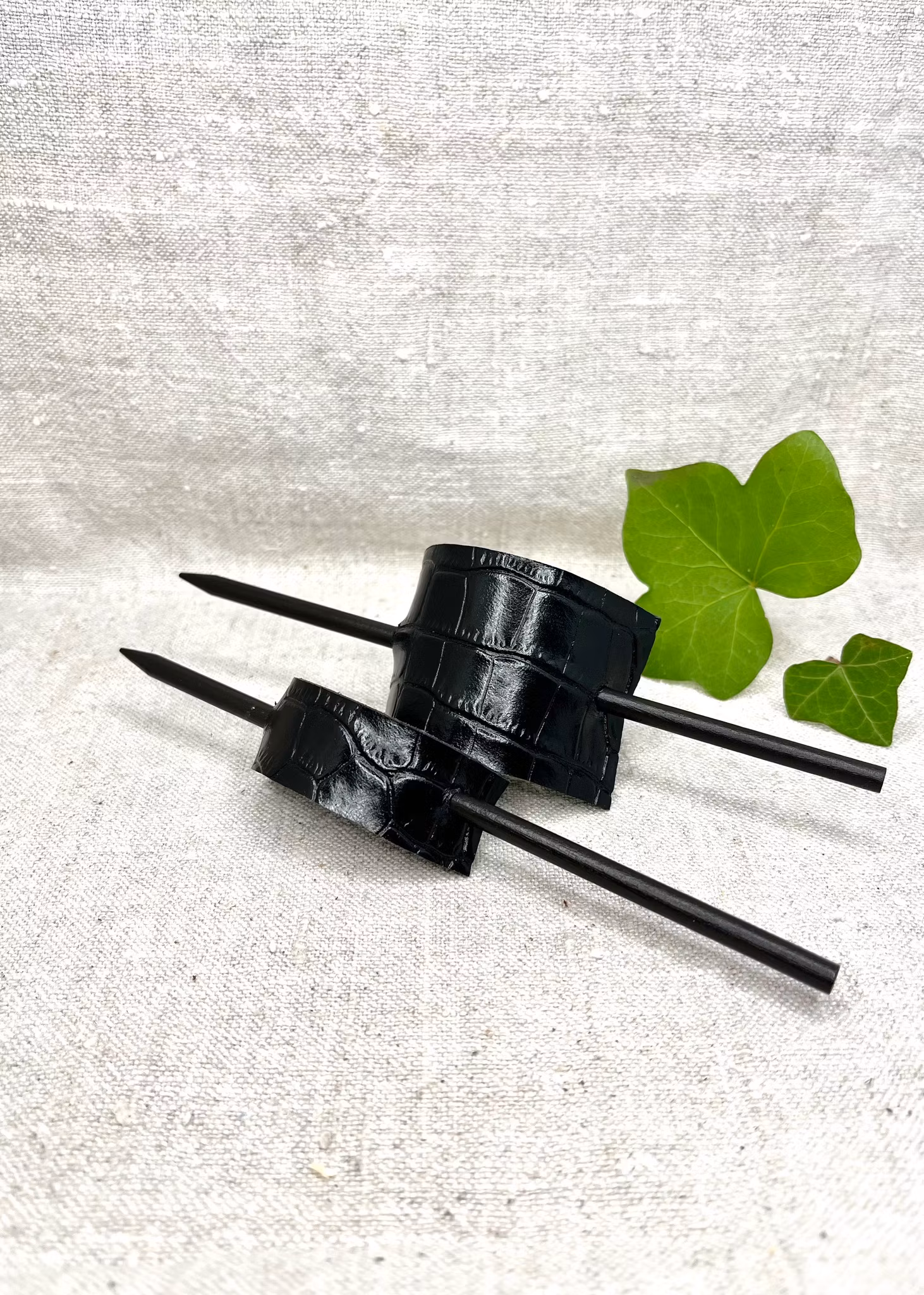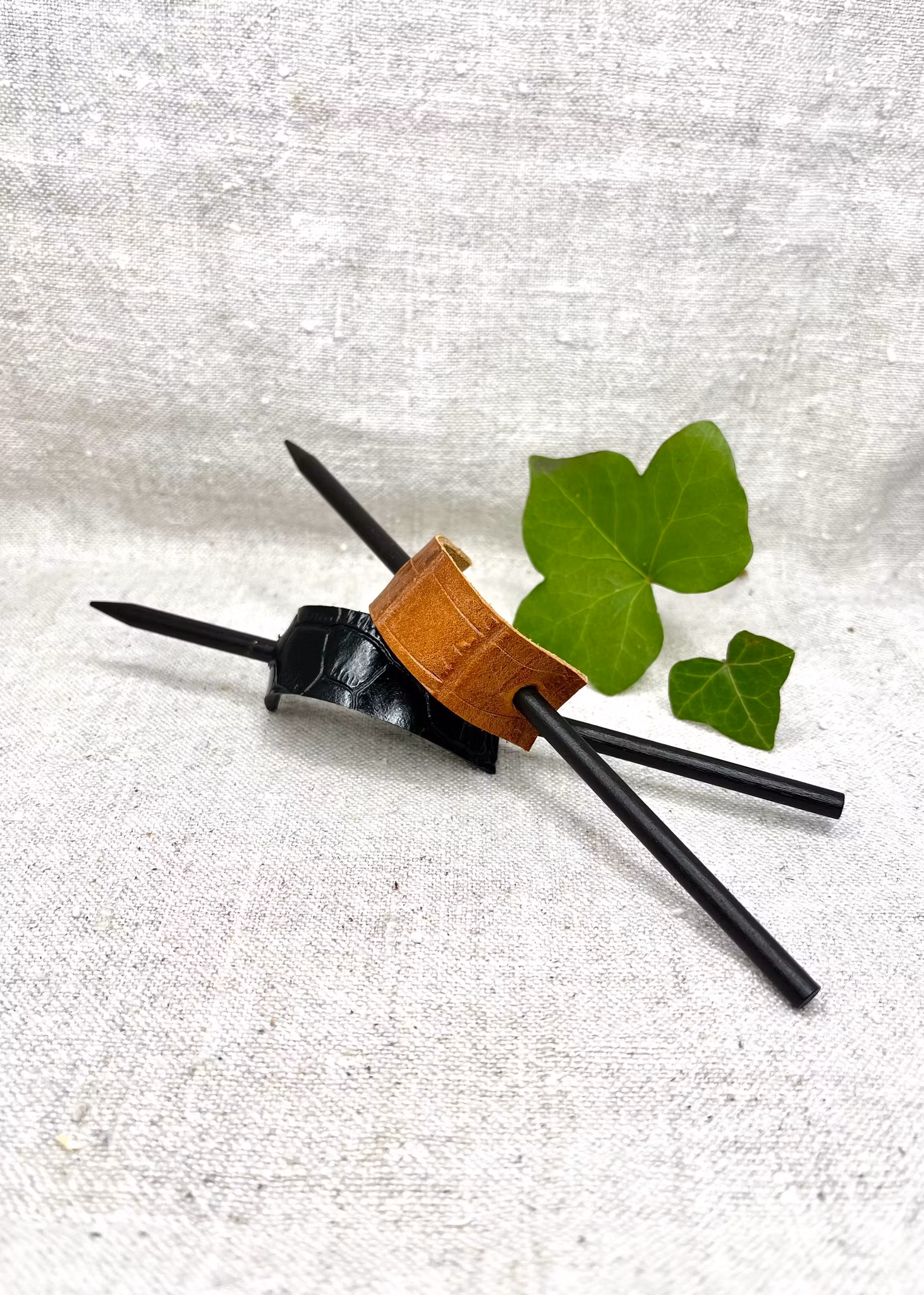"Omtag". Håruppsättning med svart pinne och kraftigt läder.