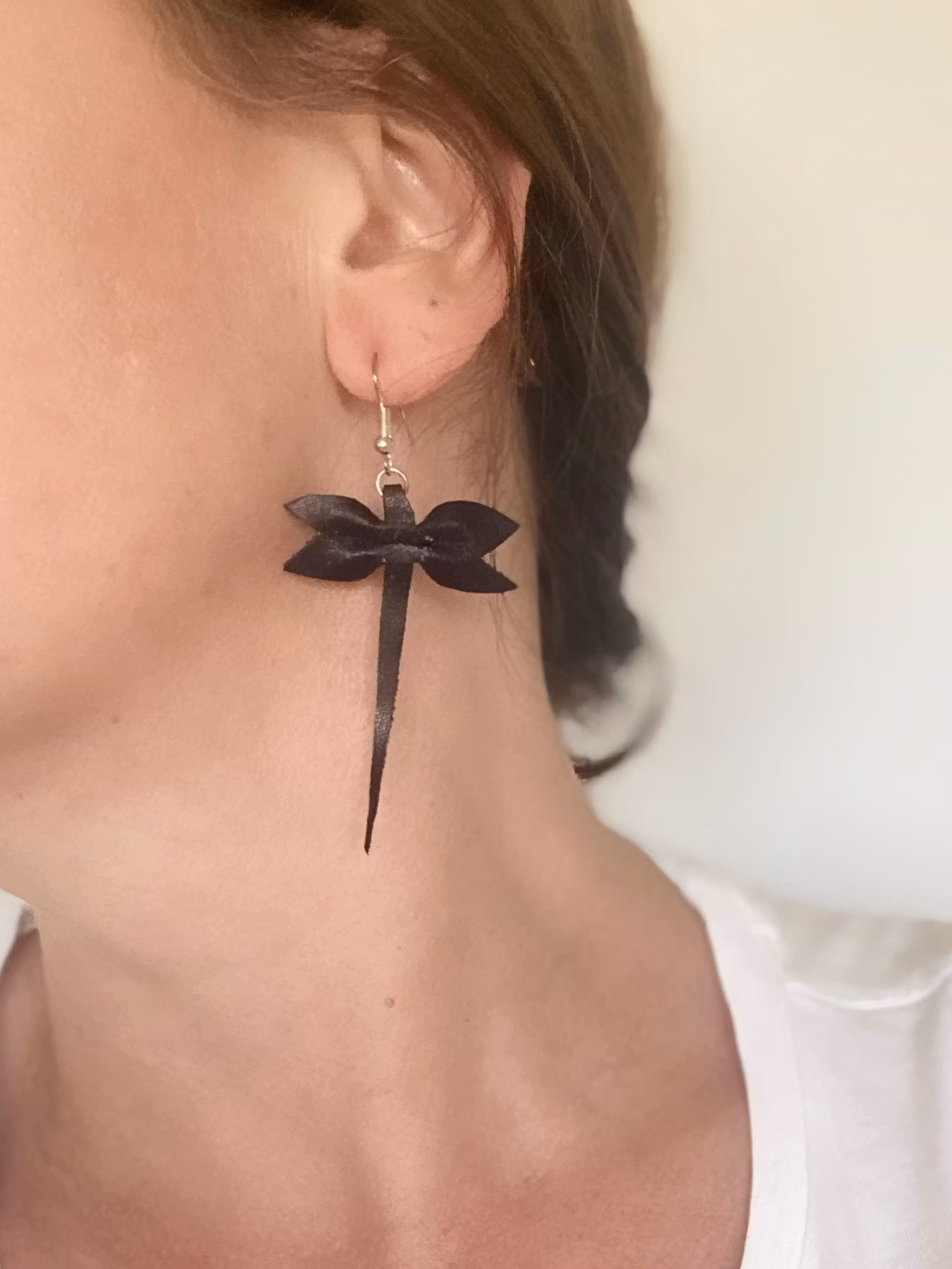 Svart "Trollslända" 299:- Handgjorda örhängen av läderspill. "Trollslända" i svart läder. Krok: Välj nedan Krok Rostfritt stål 304, silverfärgad Rostfritt stål 304, guldfärgad Sterlingsilver 925 Guldpläterad sterlingsilver 925 I lager. Lägg i varukorgen Dela Lagersaldo: Artikelnummer: 29 Information Recensioner Handgjorda läderörhängen: "Trollslända"Läder: SvartKrok: Rostfritt stål 304 eller sterlingsilver 925 / guldpläterad sterlingsilver 925Storlek: Ca 3 x 4,5 cmMed gummistopp